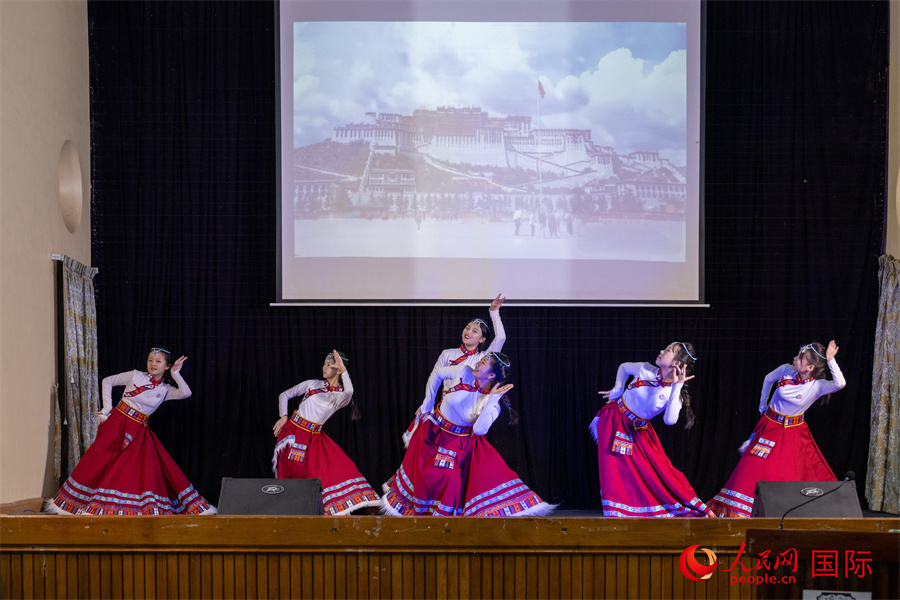 當(dāng)?shù)貙W(xué)生在中緬文化交流會(huì)上表演藏族舞蹈。人民網(wǎng)記者 謝佳君攝