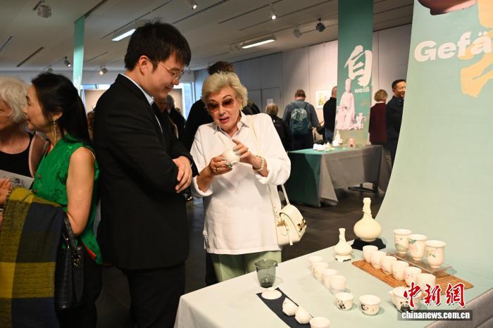 當(dāng)?shù)貢r(shí)間8月22日晚,“瓷韻茶香·閩韻悠長——福建德化白瓷與福建茶葉特展”在柏林中國文化中心開幕。圖為德國觀眾觸摸德化瓷器。柏林中國文化中心 供圖