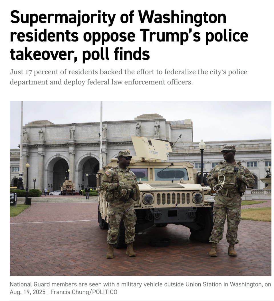 △美國(guó)“政治”網(wǎng)站報(bào)道,79%的華盛頓特區(qū)居民反對(duì)聯(lián)邦接管特區(qū)警務(wù)并部署國(guó)民警衛(wèi)隊(duì)的做法。