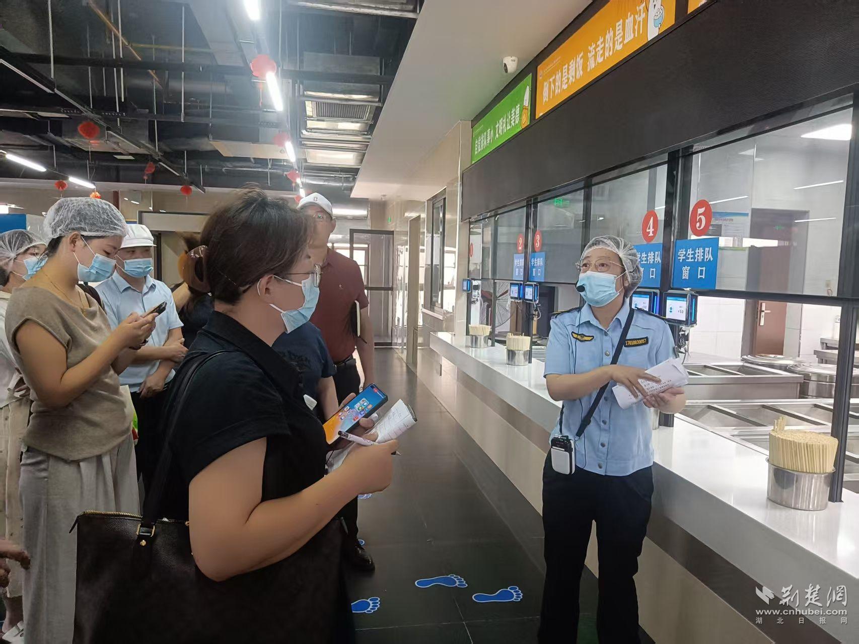 吳家山第四中學(xué)食堂內(nèi),工作人員正忙碌著為軍訓(xùn)學(xué)生做午餐。東西湖區(qū)市場監(jiān)管局餐飲科執(zhí)法人員帶領(lǐng)與會人員一邊實(shí)地觀摩,一邊現(xiàn)場授課。