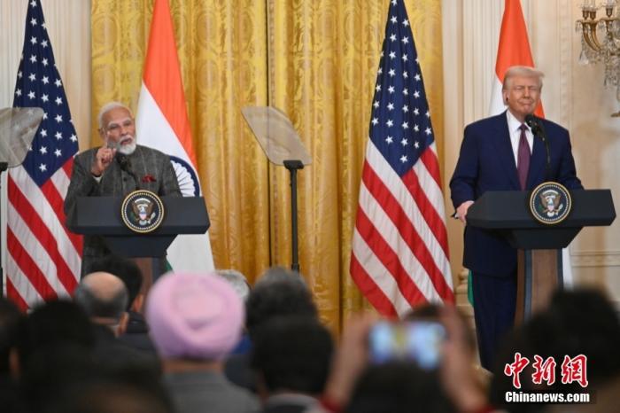 資料圖:當(dāng)?shù)貢r(shí)間2月13日,華盛頓,美國(guó)總統(tǒng)特朗普與來(lái)訪的印度總理莫迪在白宮舉行會(huì)晤。圖為雙方在會(huì)晤后出席聯(lián)合記者會(huì)。中新社記者 陳孟統(tǒng) 攝