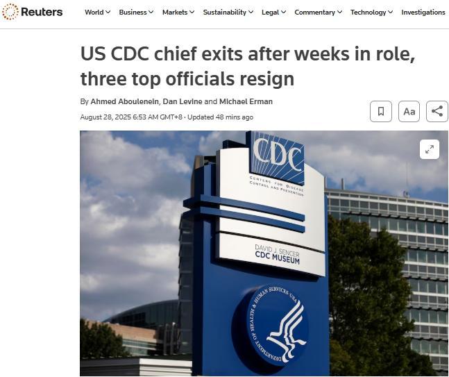 據(jù)報(bào)道,美國疾控中心醫(yī)療官員黛布拉·霍里、免疫與呼吸道疾病中心主任德米特·達(dá)斯卡拉基斯、美國國家新發(fā)與人畜共患傳染病中心主任丹·杰尼根均已辭去職務(wù)。