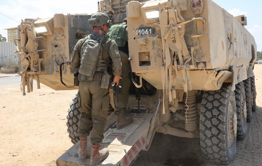 這是8月28日從加沙邊境以色列一側(cè)拍攝的以軍裝甲車和士兵。新華社發(fā)(吉爾·科恩·馬根攝)
