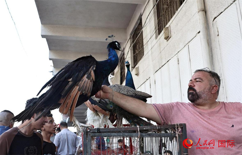 一名商販在逗弄孔雀。人民網 伊納斯·易卜拉欣攝