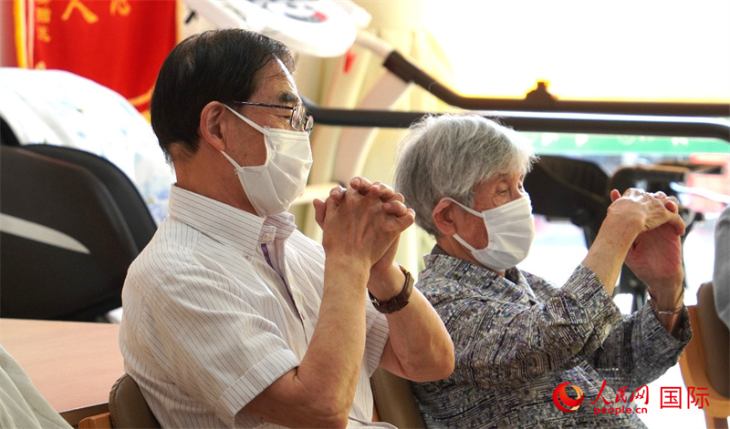 在日本的一家養(yǎng)老機構,清野明(左)和若生豐美(右)正在一起做手指操。人民網 許可攝