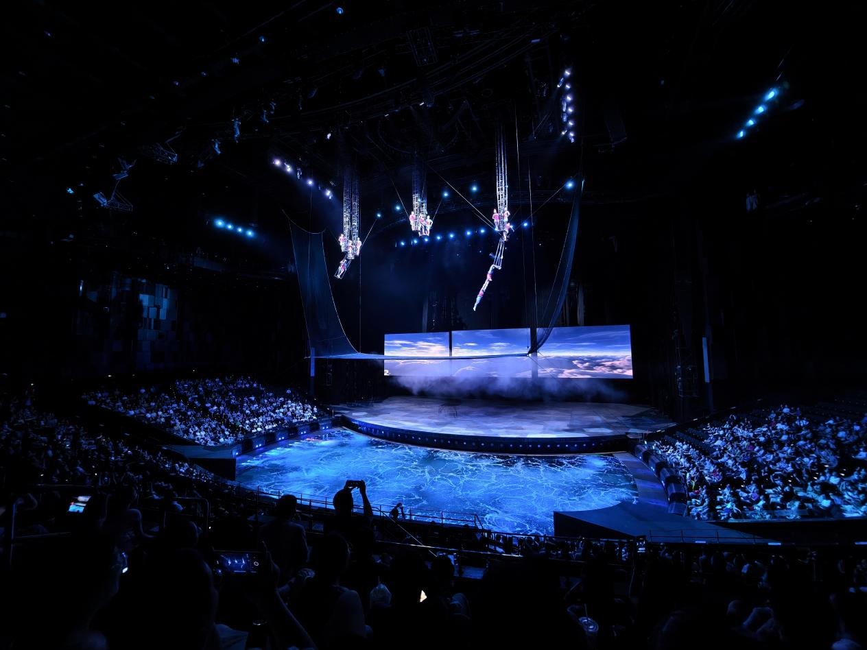 漢秀劇場版《水秀》融合了舞蹈、高空跳水、環(huán)球飛車、空中飛人、吊環(huán)、柔術等多種藝術表演形式,演員們在空中、水面和水下穿梭表演,呈現(xiàn)出一系列驚險刺激、美輪美奐的場景,令臺下觀眾驚嘆不已,掌聲不斷。