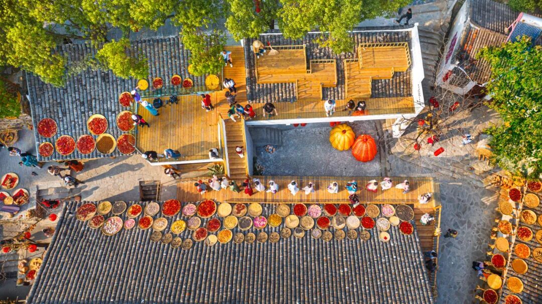 在大余灣,曬秋是鐫刻在石墻黛瓦間的詩意。簸箕托起整個秋天的饋贈——火紅的辣椒、金黃的玉米、橙黃的南瓜、褐色的板栗……層層疊疊鋪展在檐下、院中、屋頂,與明清時期的古建筑交相輝映,潑灑出中國最生動的秋日油畫。