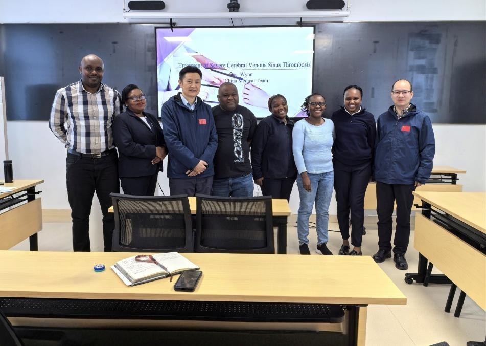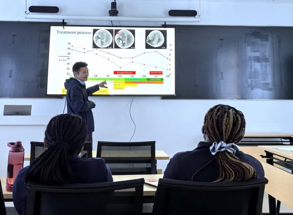 人民網(wǎng)約翰內(nèi)斯堡9月7日電 (記者鄒松)9月6日上午,中國(湖北)第19批援萊索托醫(yī)療隊在馬賽盧地區(qū)醫(yī)院開展醫(yī)學(xué)培訓(xùn)。醫(yī)療隊隊長、主任醫(yī)師吳輝在該院教學(xué)培訓(xùn)樓會議室進行題為《重癥產(chǎn)褥期腦靜脈竇血栓伴出血、腦疝患者救治過程分享》的學(xué)術(shù)講座。培訓(xùn)對象為馬賽盧地區(qū)醫(yī)院重癥監(jiān)護室非值班醫(yī)護人員,活動獲得熱烈反響。