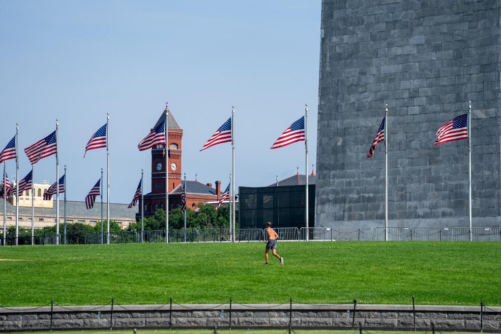 6月23日,在美國首都華盛頓,一名男子在草地上跑步。新華社記者胡友松攝