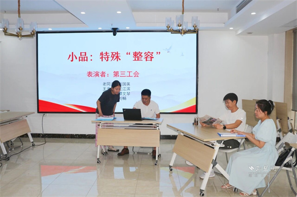 才藝展示團隊賽環(huán)節(jié),《心靈美容院》《“照鏡子 正衣冠”研討會》《特殊整容》等精彩節(jié)目輪番上演。黨群干部通過小品、朗誦、合唱等多元形式,生動呈現(xiàn)在思想引導、作風建設和團隊凝聚中的實踐與思考,剖析了工作中的“痛點”“堵點”,映射出黨群工作者直面問題的工作實效。