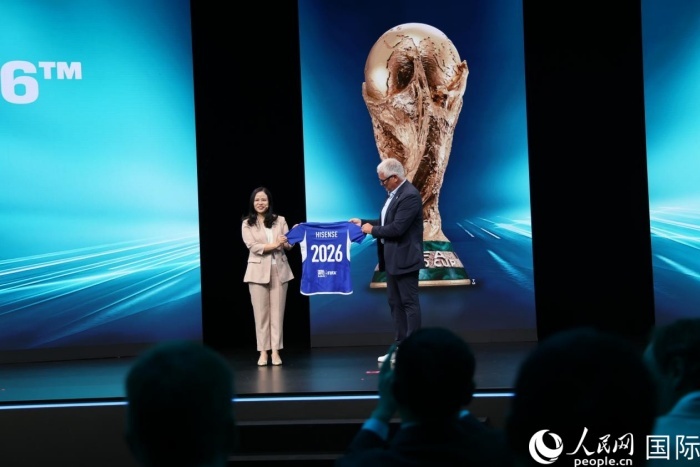 圖為國際足聯(lián)首席商務(wù)官羅米·蓋伊向海信代表贈(zèng)送2026世界杯紀(jì)念品。人民網(wǎng)記者 劉仲華攝