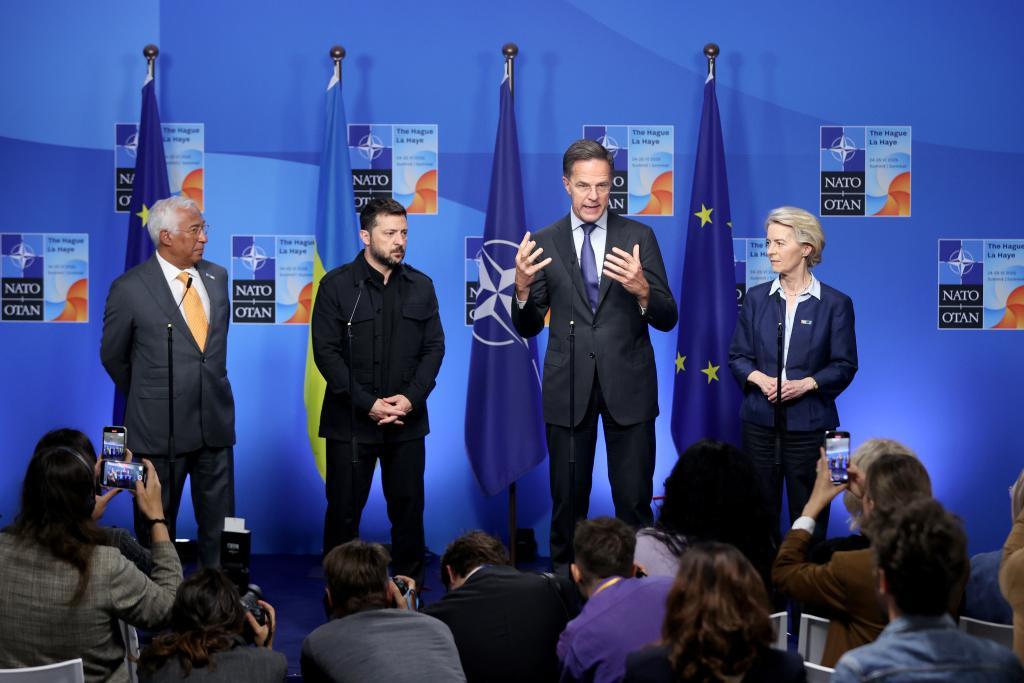 6月24日,在荷蘭海牙,歐洲理事會(huì)主席科斯塔、烏克蘭總統(tǒng)澤連斯基、北約秘書長(zhǎng)呂特和歐盟委員會(huì)主席馮德萊恩(從左至右)在北約峰會(huì)期間共見記者。新華社記者趙丁喆攝