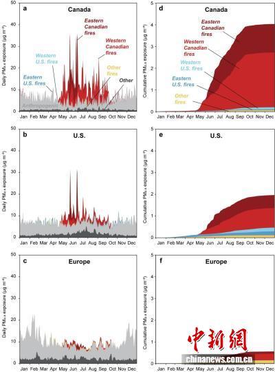 不同來源野火對2023年加拿大、美國和歐洲地區(qū)人群逐日PM2.5污染暴露水平貢獻(xiàn)的示意圖。張強(qiáng) 供圖