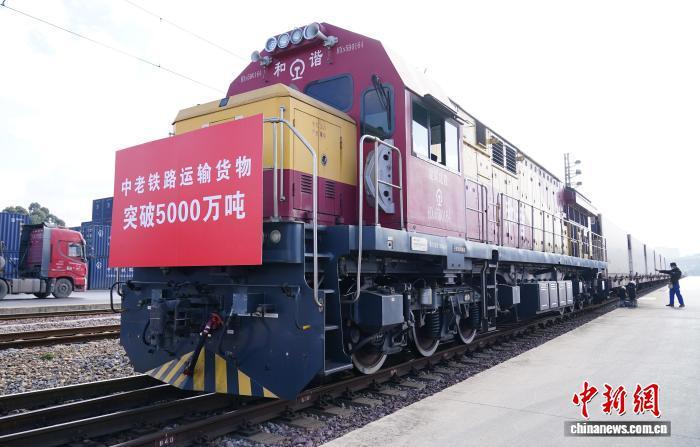 2025年1月2日,一列滿載新鮮果蔬的中老鐵路國際貨物列車從中國云南昆明啟程駛向老撾,標(biāo)志著自2021年12月3日全線開通運營以來,中老鐵路貨物運輸總量突破5000萬噸?!≈行律缬浾?劉冉陽 攝