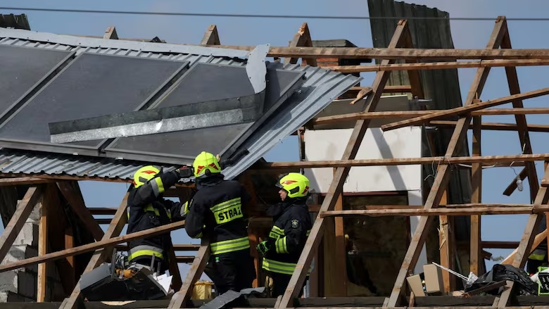 △波蘭盧布林地區(qū),消防員聚集在一座被無人機損毀的房屋屋頂上進行檢查。