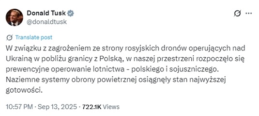 △13日,波蘭總理圖斯克在社交平臺X上發(fā)帖稱,波蘭及其盟友已在本國領空展開“預防性”空中行動。