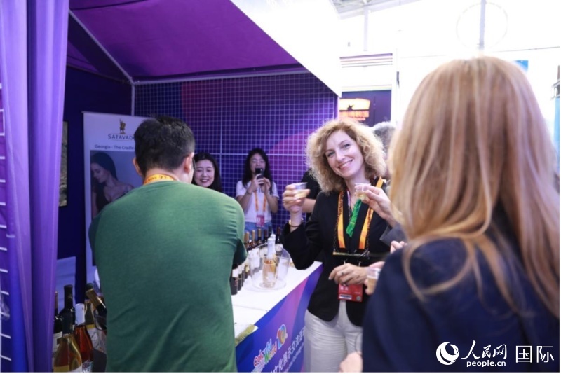 格魯吉亞展商在品嘗紅酒。人民網(wǎng)記者 賈文婷攝