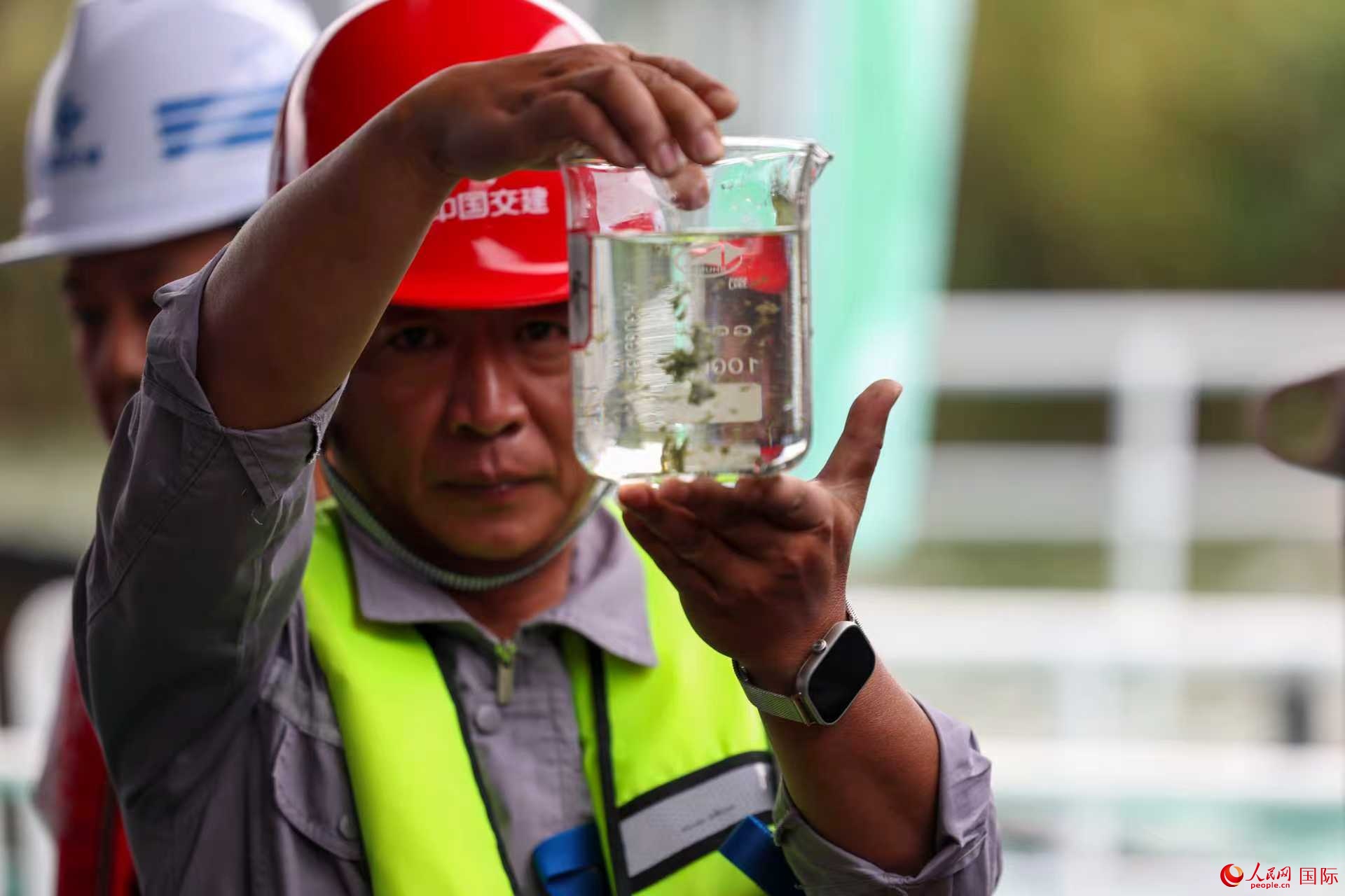 工作人員向2025“一帶一路”媒體合作論壇中外媒體聯(lián)合采訪團展示藍藻從水中分離的技術(shù)。人民網(wǎng)記者 張武軍攝