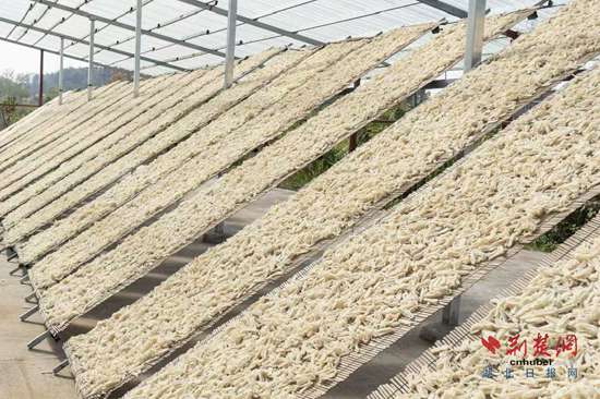而這樣的環(huán)境催生了“豆絲”這一鄂州傳統(tǒng)美食。除了大米外,綠豆、黃豆、葛根等“豆絲”原材料生長在山溝、溪邊、林中?!懊磕耆攵瑤缀跫壹移鸫笤铋_始制作豆絲,風(fēng)干后可以留存整個冬天?!敝軛罱榻B。