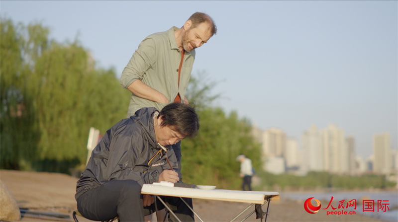 意大利藝術家馬泰奧與中國藝術家陳明坤在黃河之濱共創(chuàng)。人民網(wǎng) 嚴小晶攝