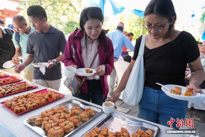 9月23日,尼泊爾中國文化中心在加德滿都舉行中秋主題活動,尼泊爾友人挑選多種口味的中式月餅?!≈行律缬浾?崔楠 攝