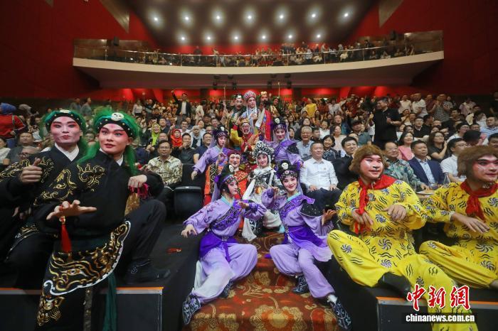 9月23日晚,浙江婺劇團(tuán)雅加達(dá)專(zhuān)場(chǎng)上演。圖為謝幕后,眾演員與觀眾合影。中新社記者 李志全 攝