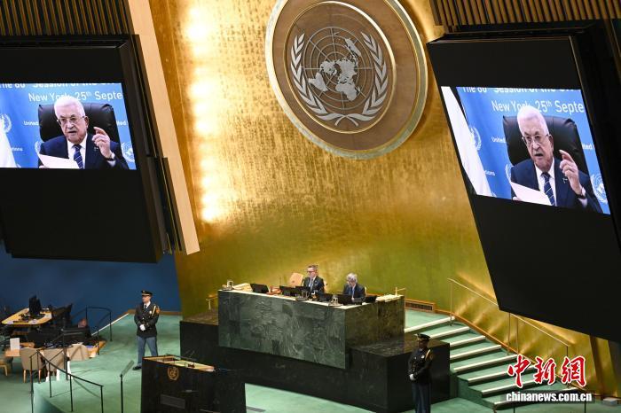 當地時間9月25日,紐約聯(lián)合國總部,巴勒斯坦總統(tǒng)阿巴斯以視頻形式在第80屆聯(lián)合國大會一般性辯論中發(fā)言。 中新社記者 陳孟統(tǒng) 攝