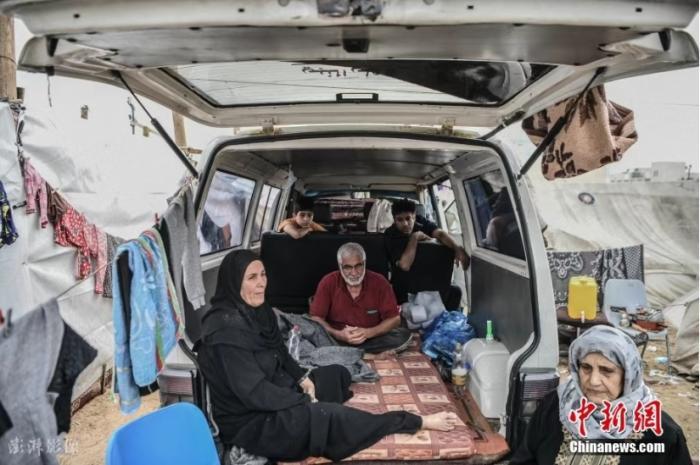 資料圖:加沙汗尤尼斯,巴以沖突持續(xù),當(dāng)?shù)卦庖陨幸u擊后,流離失所的當(dāng)?shù)孛癖娫诶щy條件下艱難求生。因家園被摧毀,他們選擇住在汽車(chē)內(nèi)或是搭起的臨時(shí)帳篷。