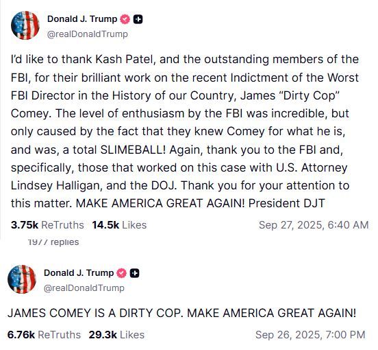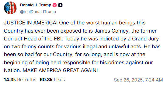 科米被起訴消息公布后,特朗普立即在社交媒體上表示“慶祝”,稱科米“長(zhǎng)期以來對(duì)美國非常壞”,現(xiàn)在“正義終于得到伸張”。就在數(shù)天前,特朗普還在社交媒體上發(fā)帖,抱怨司法部對(duì)科米的調(diào)查遲遲沒有下文,要求盡快對(duì)科米提起訴訟。