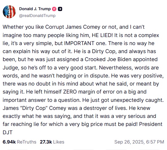 新華社北京9月27日電 美國弗吉尼亞州東區(qū)聯(lián)邦地區(qū)法院的一個(gè)大陪審團(tuán)25日決定,以“虛假陳述”和“妨礙國會(huì)程序”等罪名起訴聯(lián)邦調(diào)查局前局長(zhǎng)詹姆斯·科米。緊接著,美國總統(tǒng)特朗普在社交媒體上連發(fā)四帖攻擊科米,稱其為“骯臟警察”“卑鄙小人”。
