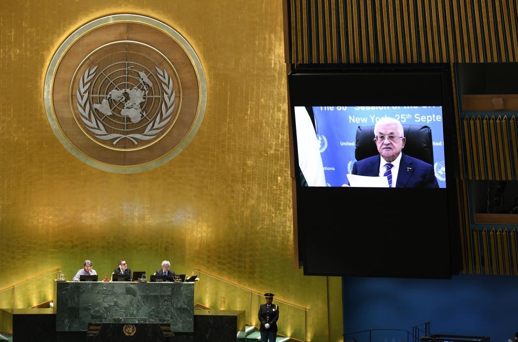 9月25日,在位于紐約的聯(lián)合國總部,巴勒斯坦總統(tǒng)阿巴斯以視頻連線方式在聯(lián)合國大會(huì)一般性辯論上發(fā)言。新華社記者李睿攝