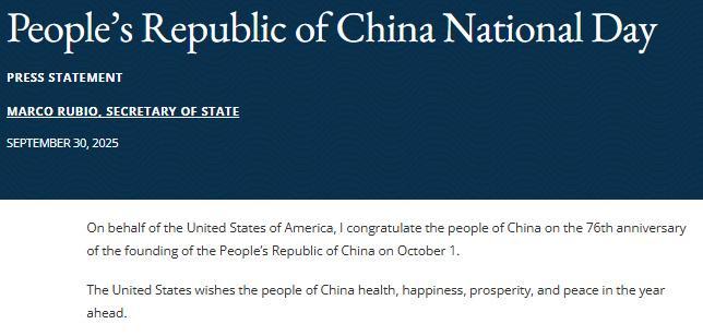 中新網(wǎng)10月1日電 根據(jù)美國國務(wù)院網(wǎng)站當(dāng)?shù)貢r間9月30日消息,美國國務(wù)卿魯比奧發(fā)表簡短聲明:我謹(jǐn)代表美利堅(jiān)合眾國,就中華人民共和國成立76周年表示祝賀。