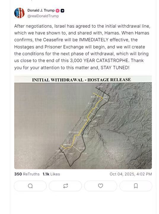 當(dāng)?shù)貢r間10月4日,美國總統(tǒng)特朗普在其社交平臺“真實(shí)社交”發(fā)文稱,以色列已同意加沙地帶初步撤軍路線,并將相關(guān)方案與巴勒斯坦伊斯蘭抵抗運(yùn)動(哈馬斯)共享。一旦哈馬斯確認(rèn),?;饘⒘⒓瓷?/strong>,被扣押人員與囚犯交換隨即啟動。