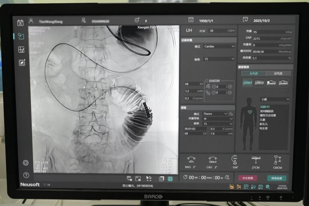 為盡快解除患者痛苦,黃遷祥主任及其團(tuán)隊(duì)毅然放棄節(jié)假日休息。手術(shù)當(dāng)日,在清晰的影像引導(dǎo)下,黃遷祥憑借嫻熟的技術(shù)和豐富的經(jīng)驗(yàn),精準(zhǔn)地將一根3米長(zhǎng)的腸梗阻導(dǎo)管經(jīng)鼻腔置入,并成功引導(dǎo)其通過(guò)幽門、十二指腸,直達(dá)梗阻近端的腸腔內(nèi)。整個(gè)過(guò)程猶如在消化道迷宮中完成了一次精準(zhǔn)的“穿針引線”。該導(dǎo)管能在腸蠕動(dòng)及重力的共同作用下,在小腸內(nèi)不斷前進(jìn),持續(xù)吸引梗阻近端的液體和氣體,從而迅速改善患者腹痛、腹脹的癥狀,減輕腸腔壓力和腸壁水腫,緩解梗阻癥狀。