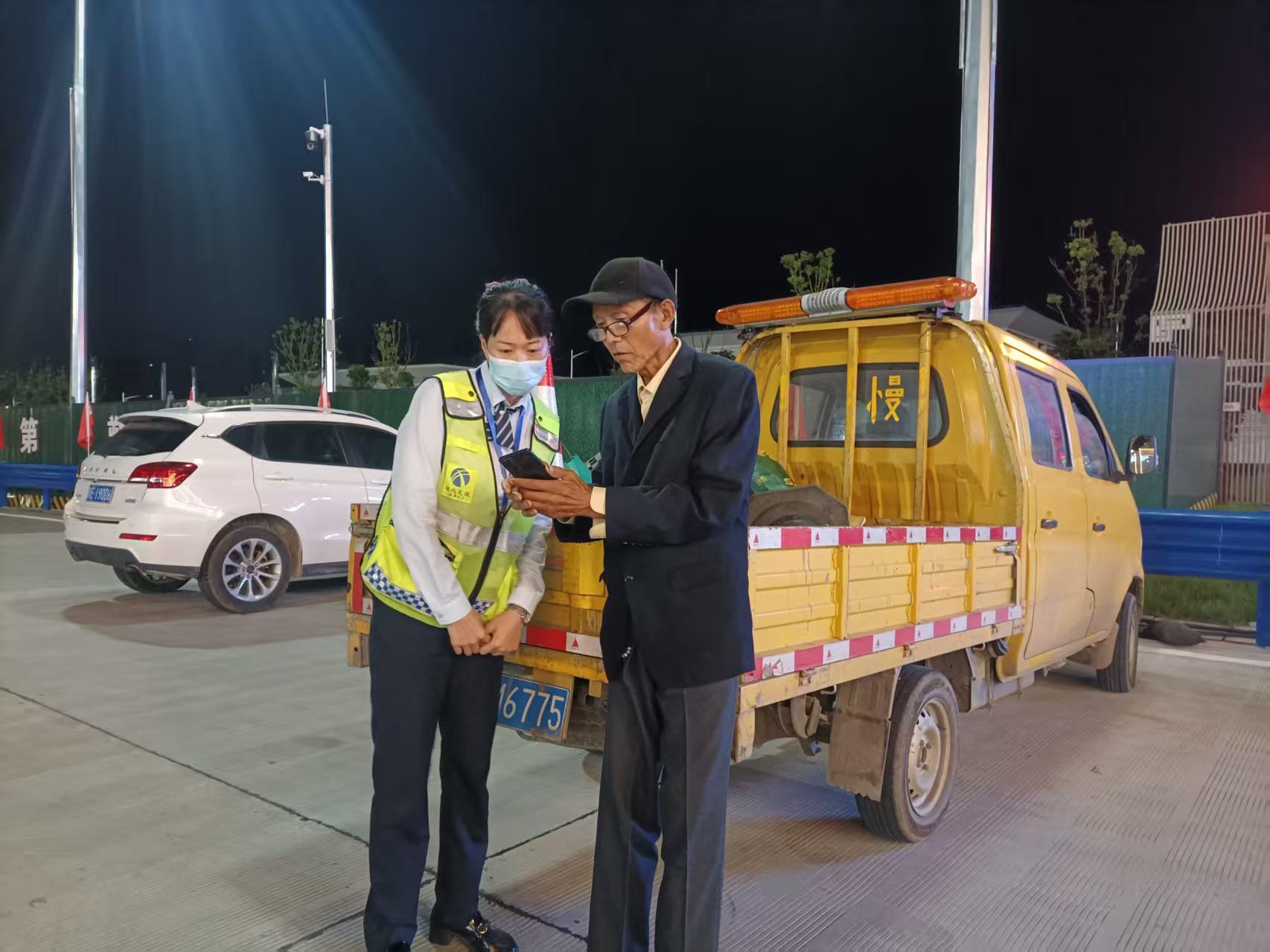 當(dāng)天凌晨2時(shí)許,一位老人茫然地站在孝感收費(fèi)站廣場上,神情低落,顯得不知所措。正在外場巡邏的收費(fèi)班長王燕玲發(fā)現(xiàn)了這一情況,便主動上前詢問。
