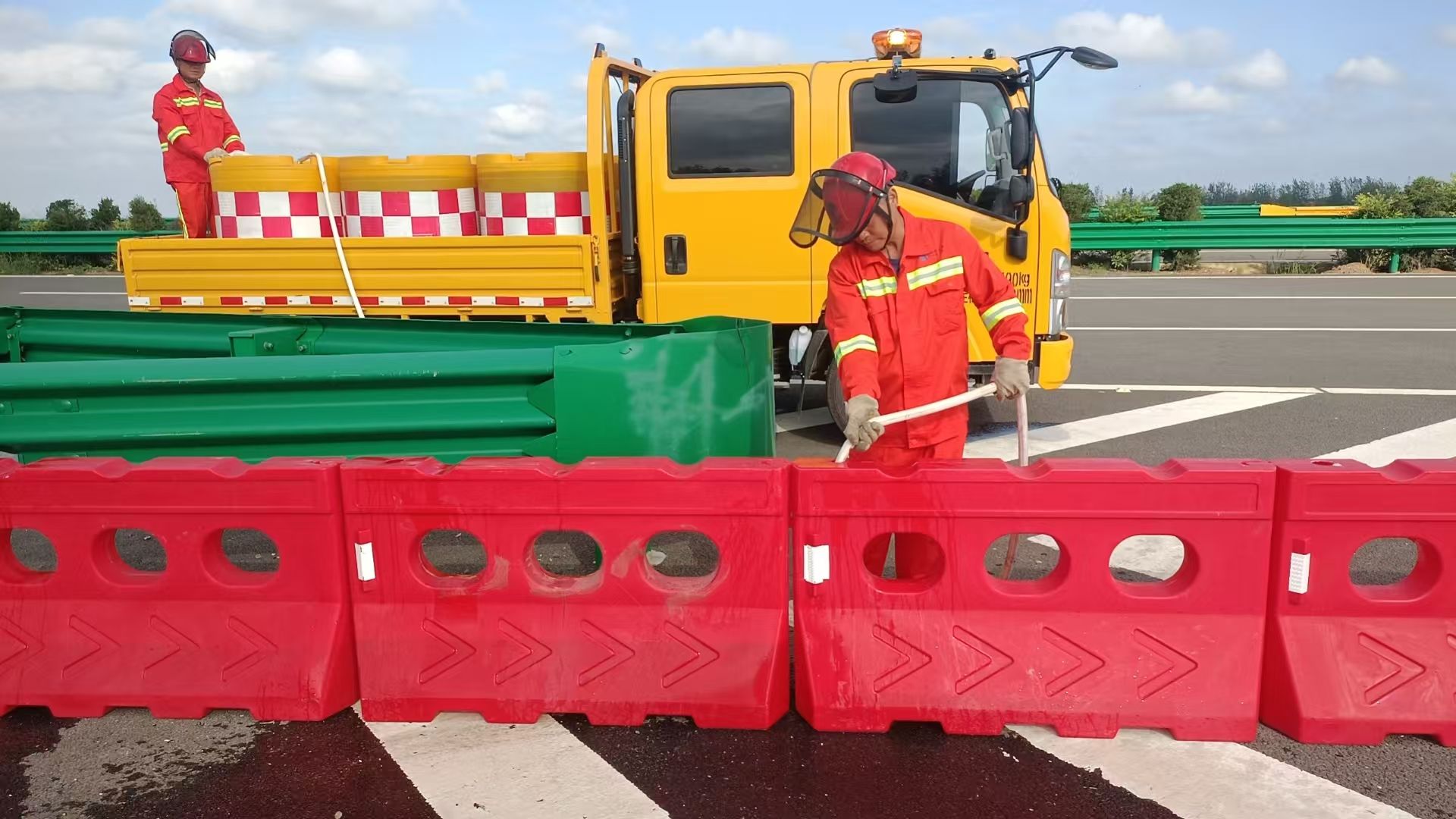 圖:漢孝向K291+487三角端擺放警示提醒的水馬并進行應(yīng)急注水