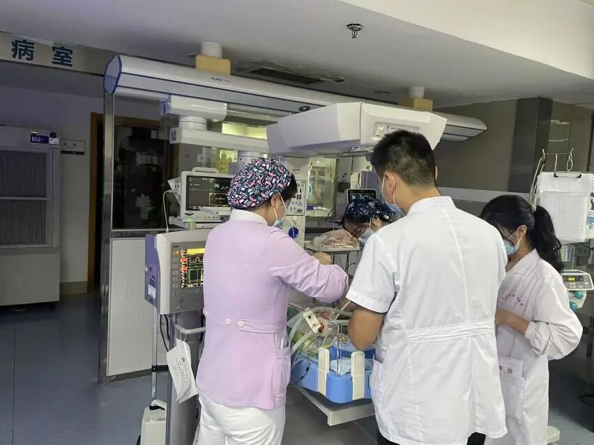 與此同時(shí),在救護(hù)車返回本院前,新生兒科病房已做好全面準(zhǔn)備:呼吸機(jī)、復(fù)蘇設(shè)備、嬰兒輻射保暖臺(tái)及B超設(shè)備等一應(yīng)俱全?;純阂唤?jīng)送達(dá),便通過(guò)綠色通道直接接入新生兒重癥監(jiān)護(hù)室(NICU),醫(yī)療團(tuán)隊(duì)迅速展開一系列搶救措施:機(jī)械通氣、補(bǔ)液、抗感染治療,并完成床邊X光、肺臟彩超、顱腦及心臟彩超等周密檢查。團(tuán)隊(duì)依據(jù)檢查結(jié)果精準(zhǔn)制定治療方案,細(xì)致落實(shí)護(hù)理措施,為危重新生兒提供全方位、高水平的醫(yī)療支持。
