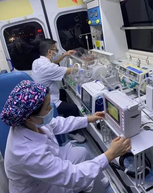 轉(zhuǎn)運(yùn)團(tuán)隊(duì)由一名新生兒科副主任醫(yī)師、一名新生兒科主管護(hù)師、一名急診科主管護(hù)師和一名資深司機(jī)組成。在短短十分鐘內(nèi),團(tuán)隊(duì)迅速集結(jié)完畢,并配備了齊全的“移動(dòng)ICU”設(shè)備,包括新生兒轉(zhuǎn)運(yùn)暖箱、便攜式呼吸機(jī)、多參數(shù)監(jiān)護(hù)儀、輸液泵及急救藥品等。其中,新生兒轉(zhuǎn)運(yùn)暖箱堪稱寶寶途中的“生命堡壘”,其恒溫、恒濕、防震設(shè)計(jì),能夠全面應(yīng)對(duì)路途中的各種挑戰(zhàn),為患兒提供最安全的保護(hù)。