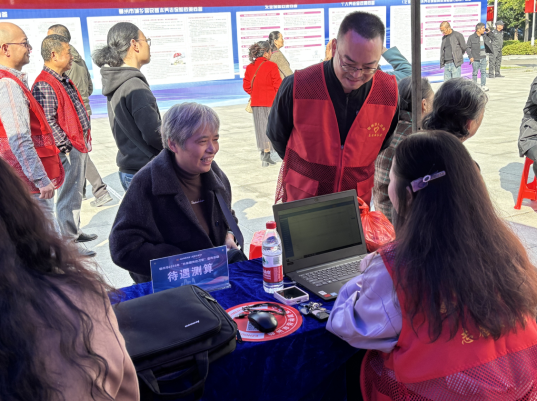 鄂州市“社保服務(wù)進(jìn)萬家”主場(chǎng)活動(dòng)現(xiàn)場(chǎng),工作人員為即將退休的群眾測(cè)算社保待遇。