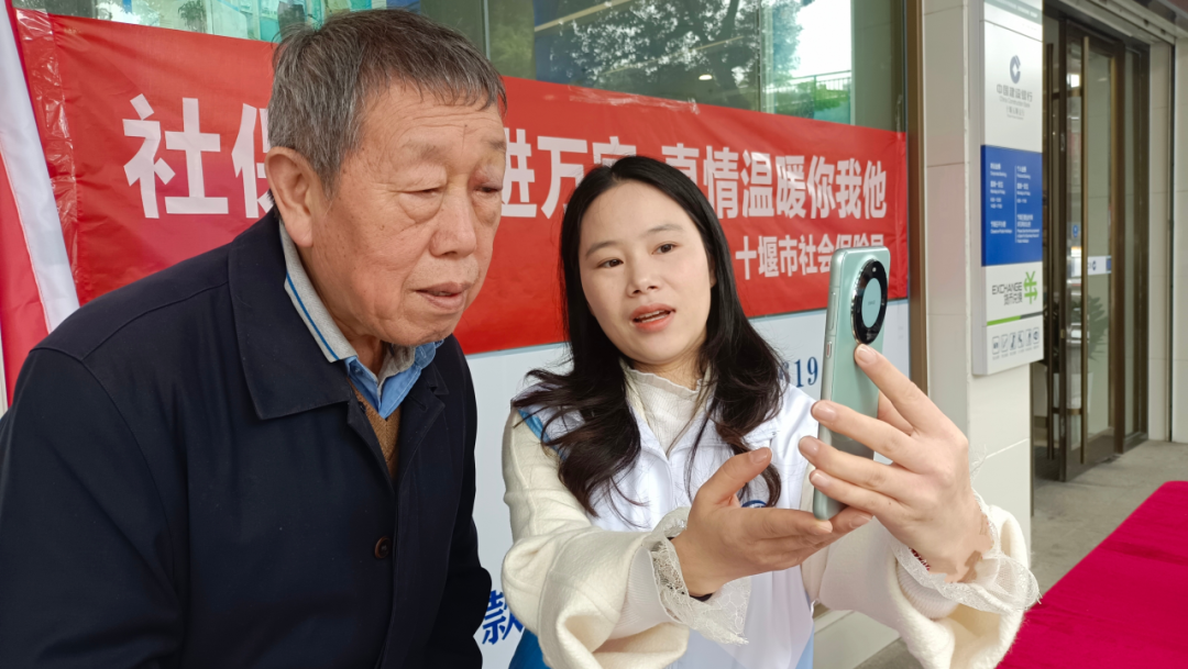 十堰市五堰建行“社銀合作”網(wǎng)點(diǎn),工作人員向群眾演示社保業(yè)務(wù)“掌上辦”。