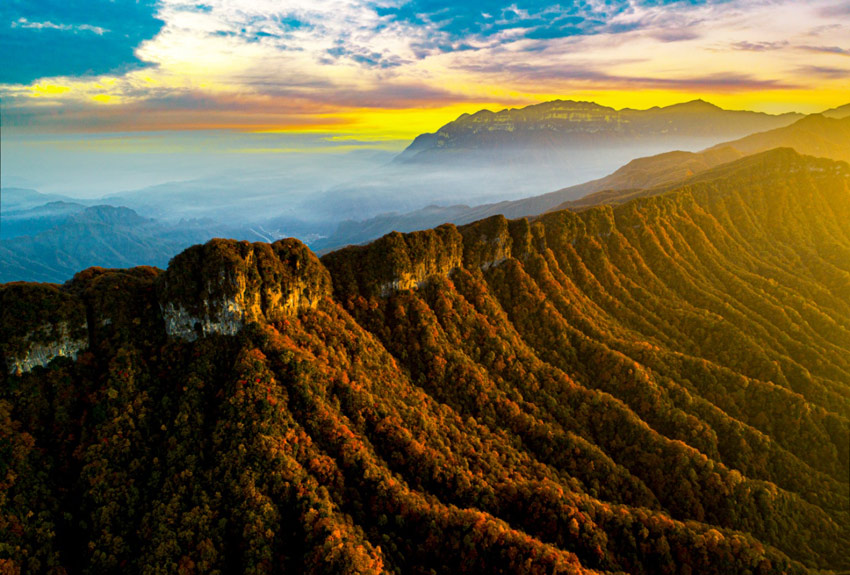 光明璀璨,霧象萬千。光霧山,地處中國南北氣候分界線,獨特的地理位置和復(fù)雜多變的山地氣候,孕育了極其豐富的植物群落。每當(dāng)深秋時節(jié),寒意浸染,以巴山水青岡、槭樹、黃櫨等為主的680平方公里彩林,便奏起了生命的華彩樂章。色彩從山頂向山谷層層浸染,緋紅、橙紅、霞紅、金紅、絳紫……各種紅色交織疊加,如巨幅油畫,似流霞滿天,其面積之廣闊、色彩之斑斕、層次之分明、觀賞期之綿長,構(gòu)成了“亞洲最長紅地毯”的驚世之美,堪稱自然造物的奇跡。