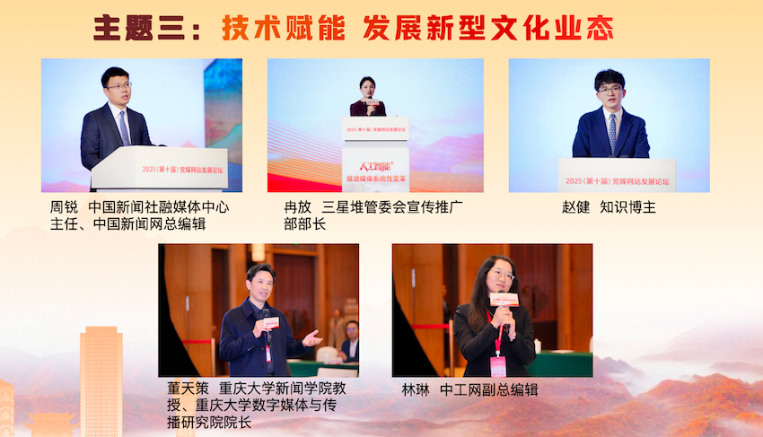 在“技術賦能 發(fā)展新型文化業(yè)態(tài)”主題研討環(huán)節(jié),中國新聞社融媒體中心主任、中國新聞網(wǎng)總編輯周銳,三星堆管委會宣傳推廣部部長冉放,知識博主趙健,分別就技術賦能中華文化“破圈”出海、三星堆文化傳播數(shù)智實踐、短視頻文化傳播等方面的經(jīng)驗成果進行了精彩展示。重慶大學新聞學院教授、重慶大學數(shù)字媒體與傳播研究院院長董天策,中工網(wǎng)副總編輯林琳作為互動嘉賓進行了點評,期待主流媒體發(fā)揮傳播實踐智慧,在內(nèi)容、技術和社會責任之間找到平衡,鑄造中華文化新輝煌。