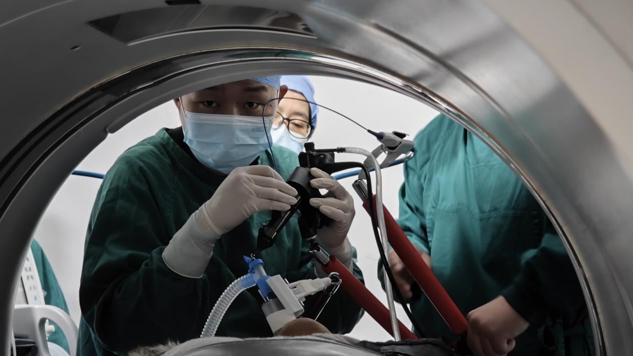 在AI+AR導(dǎo)航引導(dǎo)下,團(tuán)隊于患者目標(biāo)肺段支氣管用徑向超聲探查到實性低回聲區(qū)域,隨后通過支氣管鏡擴(kuò)張導(dǎo)管引導(dǎo)冷凍消融探頭至目標(biāo)位置。經(jīng)局部CT掃描確認(rèn)定位精準(zhǔn)后,采用“冷凍10分鐘、復(fù)溫2分鐘”的循環(huán)模式,術(shù)中最低溫度達(dá)零下156℃,最高溫度50℃,共計四個循環(huán)冷凍消融處理,復(fù)查胸部CT消融范圍基本達(dá)到預(yù)期。整個手術(shù)過程中,患者生命體征平穩(wěn),未出現(xiàn)并發(fā)癥。術(shù)后經(jīng)短期觀察,兩名患者恢復(fù)良好,均順利出院。