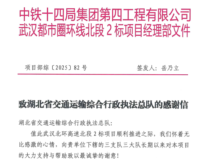 近日,湖北省交通運輸綜合行政執(zhí)法總隊收到一封來自中鐵十四局集團(tuán)第四工程有限公司的感謝信。信中,武漢都市圈環(huán)線北段2標(biāo)項目部特意致謝總隊高速公路路政執(zhí)法三支隊三大隊,稱贊其在項目施工審批、現(xiàn)場協(xié)調(diào)、交通疏導(dǎo)等關(guān)鍵環(huán)節(jié)的“全鏈條”靠前服務(wù),以專業(yè)高效的舉措為工程推進(jìn)掃清障礙,讓企業(yè)切實感受到服務(wù)速度與溫度。