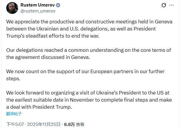 烏克蘭國家安全與國防委員會秘書烏梅羅夫則于同日在社交媒體上公開表態(tài)稱,美烏雙方代表團已就在日內(nèi)瓦討論的協(xié)議的核心內(nèi)容上,達成一致。