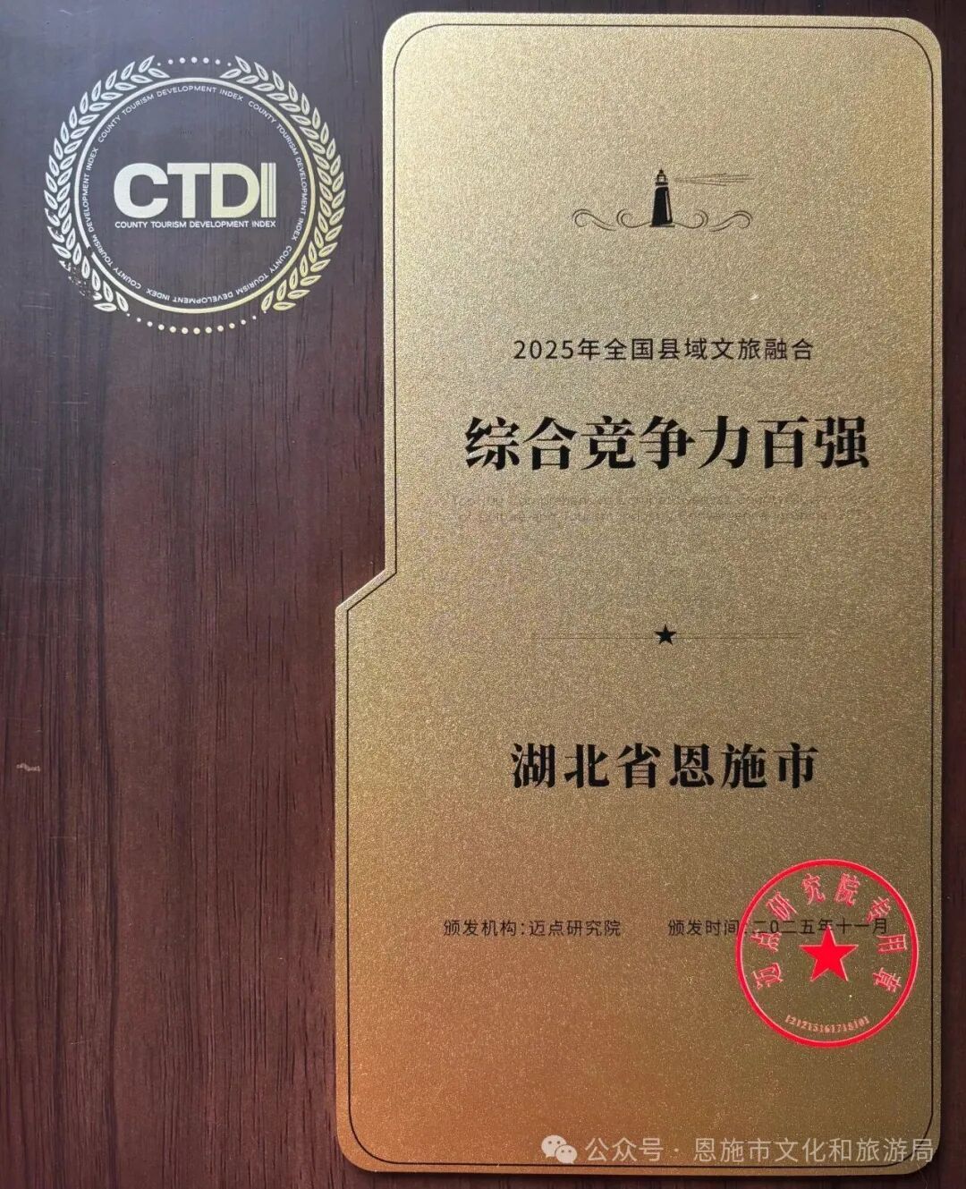 11月21日,全國(guó)縣域農(nóng)文旅發(fā)展大會(huì)在文旅行業(yè)年度盛會(huì)“2025邁點(diǎn)文旅節(jié)暨最佳東方人才周”上隆重舉行?!叭珖?guó)縣域文旅融合100強(qiáng)”榜單正式揭曉,恩施市上榜全國(guó)縣域文旅融合綜合競(jìng)爭(zhēng)力百?gòu)?qiáng)名單,位列全國(guó)第17名,向世界遞出了一張亮眼的文旅名片。