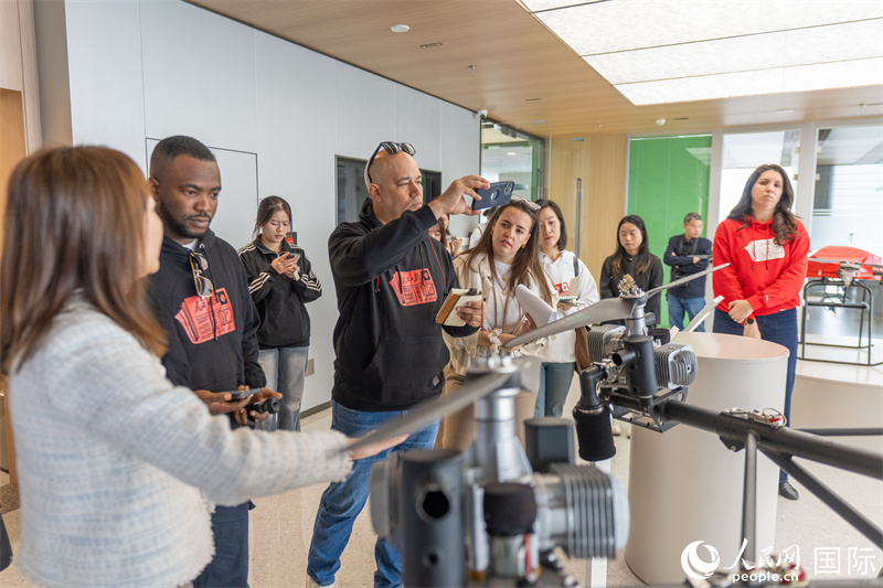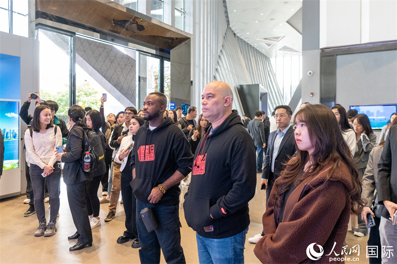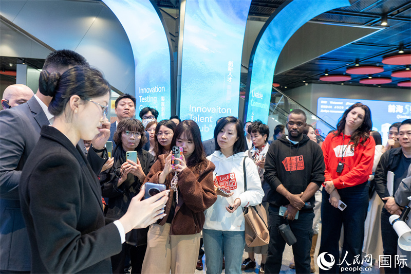 記者團(tuán)在前海5號(hào)樓參觀科技創(chuàng)新產(chǎn)品的展示并聽取講解。人民網(wǎng)記者 許崢攝