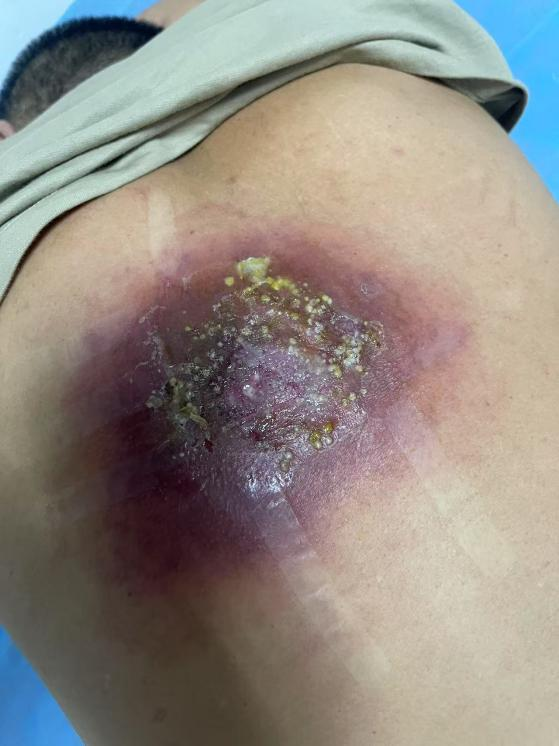 2025年10月,在三亞務工的王先生背部突然出現(xiàn)包塊,隨即發(fā)展為紅腫破潰,伴隨劇烈疼痛。盡管在當?shù)蒯t(yī)院接受了12天治療,病情卻持續(xù)惡化:創(chuàng)面不斷擴大,還出現(xiàn)全身乏力、精神萎靡等癥狀。意識到情況危急,他毅然決定轉(zhuǎn)回家鄉(xiāng)孝感市中心醫(yī)院尋求治療。