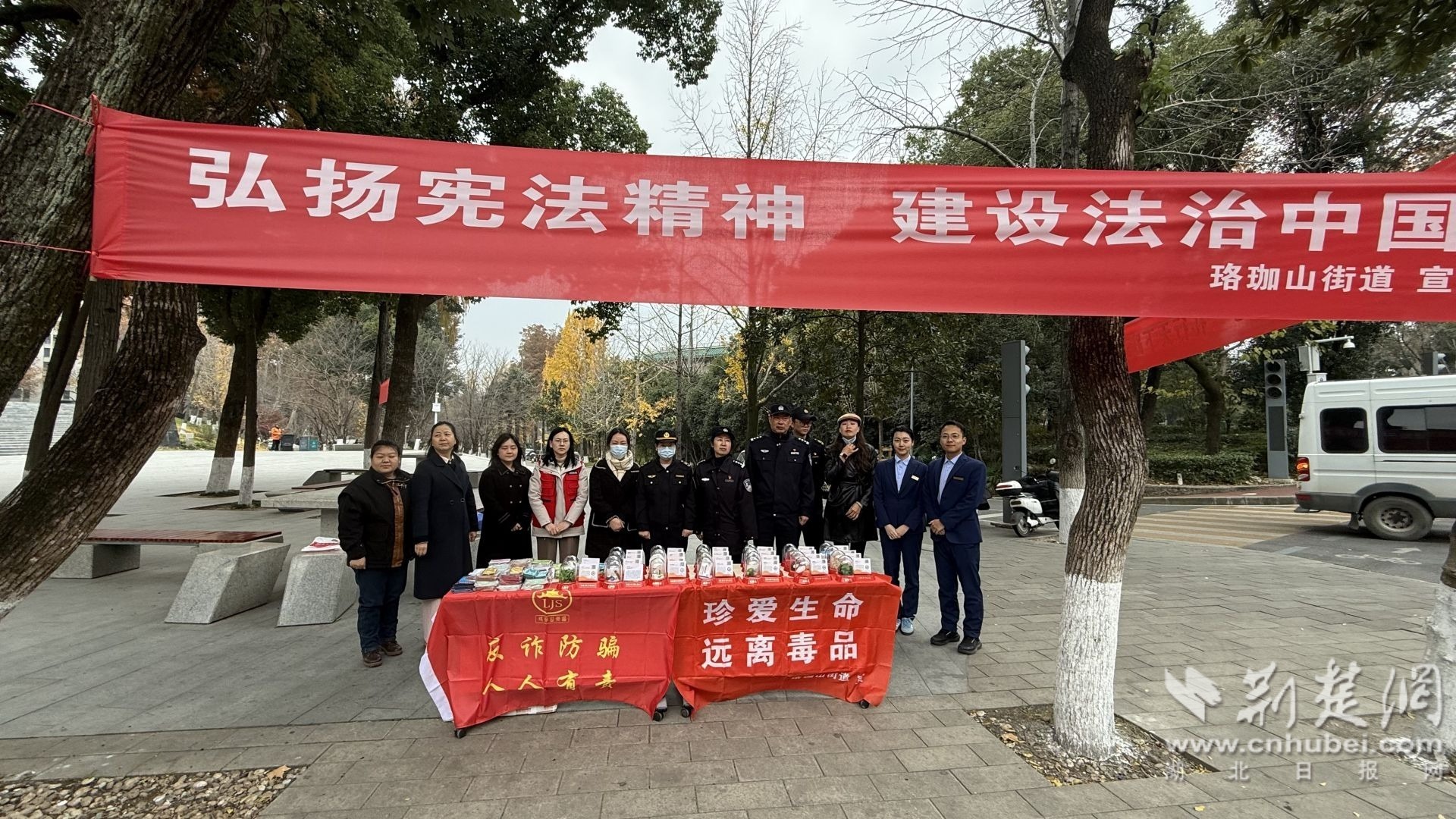 荊楚網(wǎng)(湖北日?qǐng)?bào)網(wǎng))訊(通訊員 方茜)12月4日,武昌區(qū)珞珈山街道聯(lián)合武漢大學(xué)保衛(wèi)部、轄區(qū)派出所、司法所、執(zhí)法隊(duì)等多部門,在武漢大學(xué)萬(wàn)林藝術(shù)博物館門前舉辦“憲法宣傳周”暨國(guó)家憲法日集中宣傳活動(dòng)。本次活動(dòng)以“憲法守護(hù)健康權(quán),禁毒筑牢生命線”為主題,旨在弘揚(yáng)憲法精神,增強(qiáng)全民法治觀念,同時(shí)深化禁毒宣傳教育,筑牢校園與社會(huì)禁毒防線。