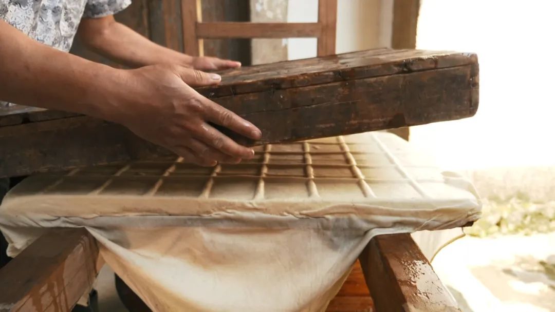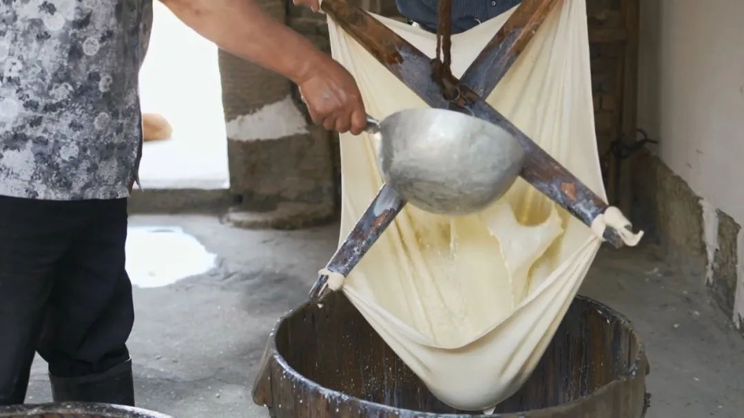過濾后的生豆?jié){在廚房里燒煮直到沸騰。燒開的豆?jié){裝缸后再被抬到堂屋,加入熟石膏,靜置一段時間就能生成豆腐腦。最后就是上架壓制豆腐干子了,這些其實(shí)都就是傳統(tǒng)豆腐的做法。